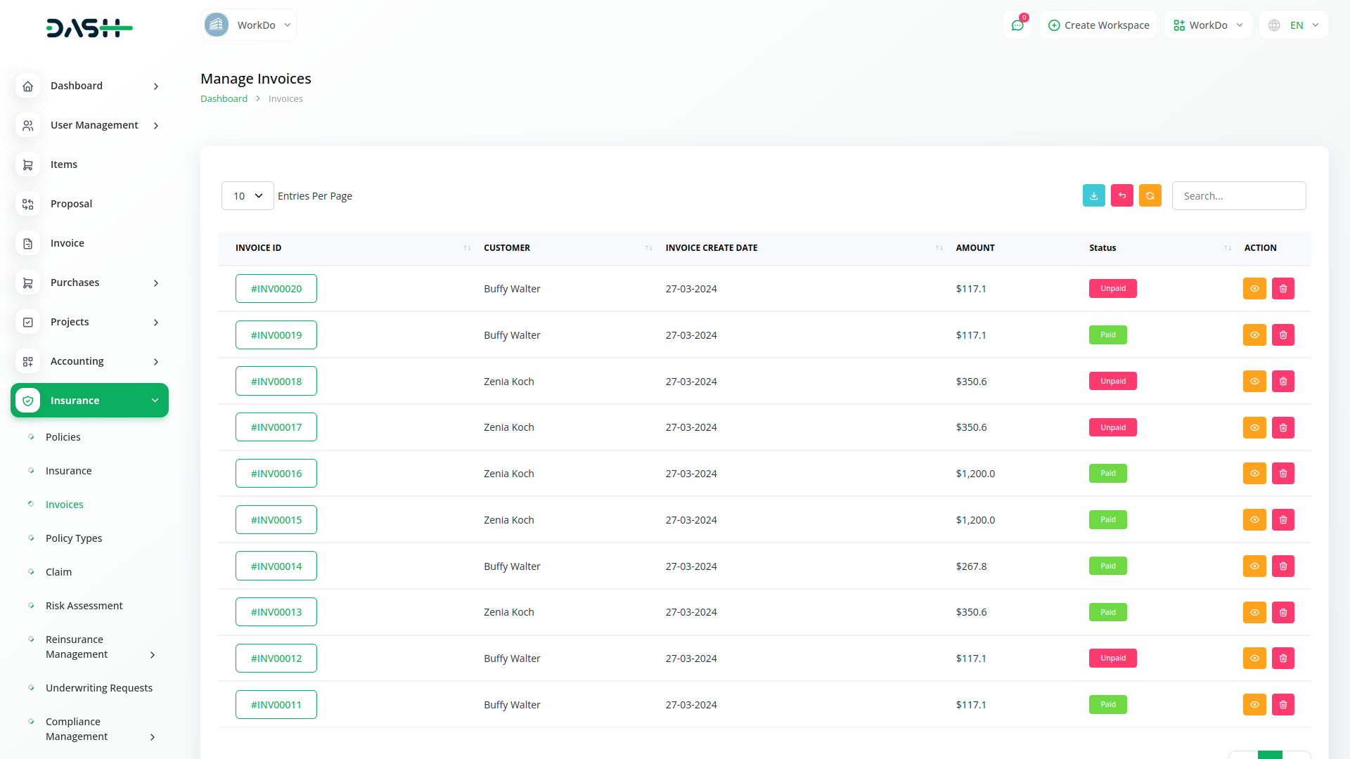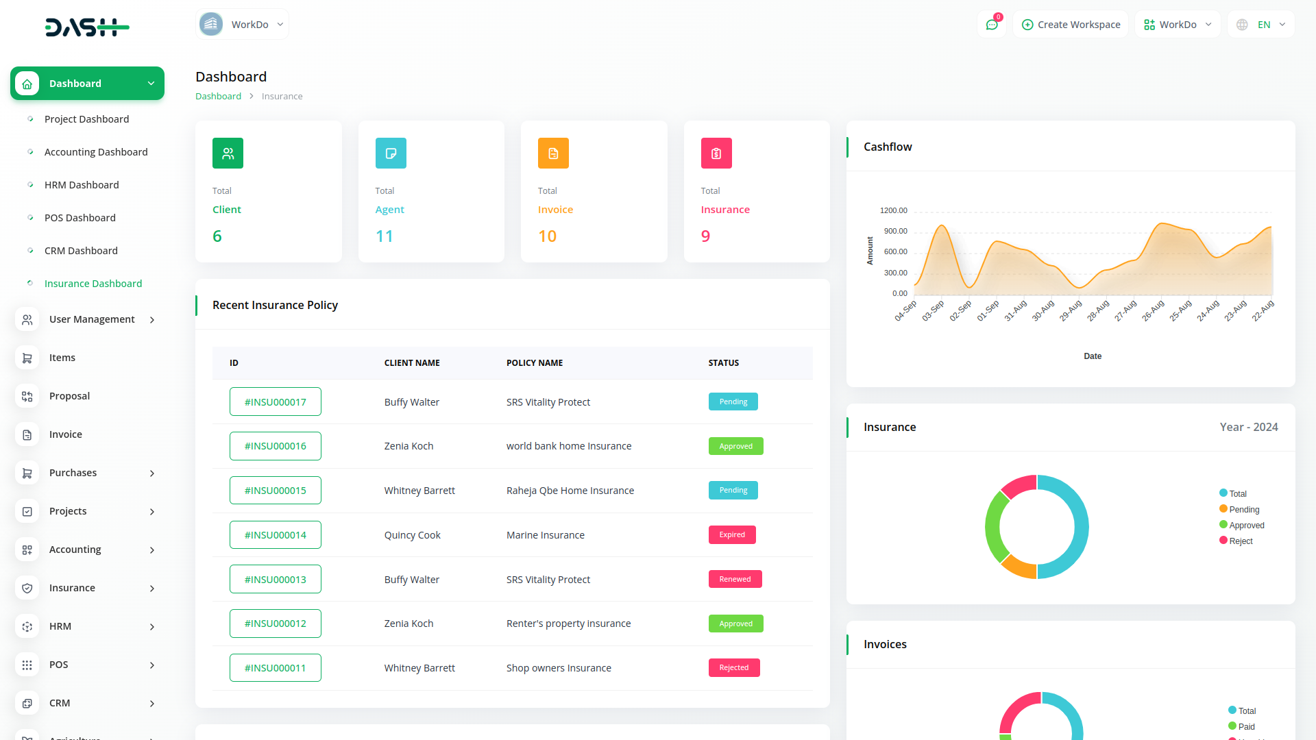 Streamline your insurance operations effortlessly with our comprehensive module in Dash SaaS. From client management to policy administration, access all your insurance-related tasks in one centralized dashboard, ensuring efficiency, accuracy, and compliance at every step.