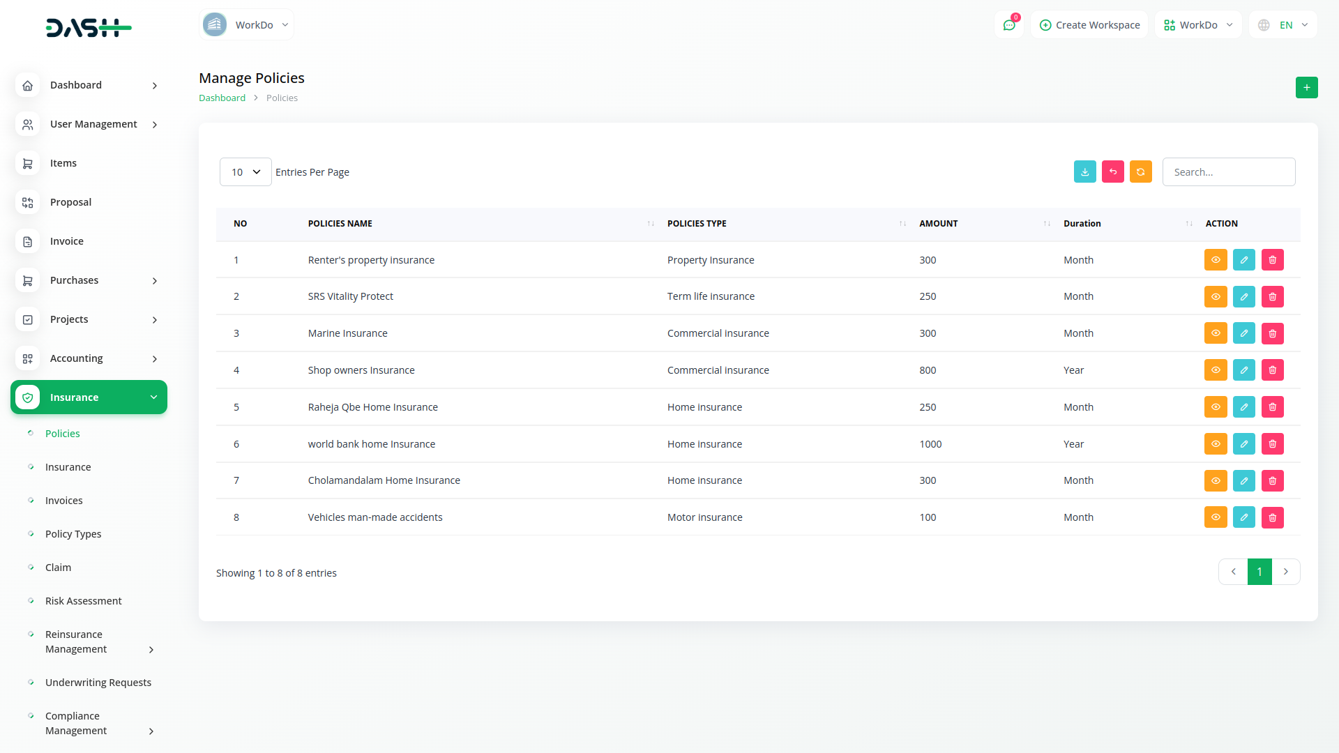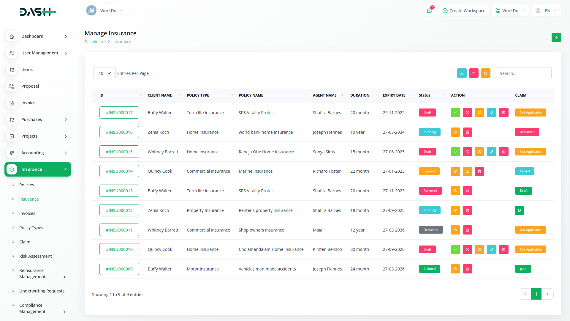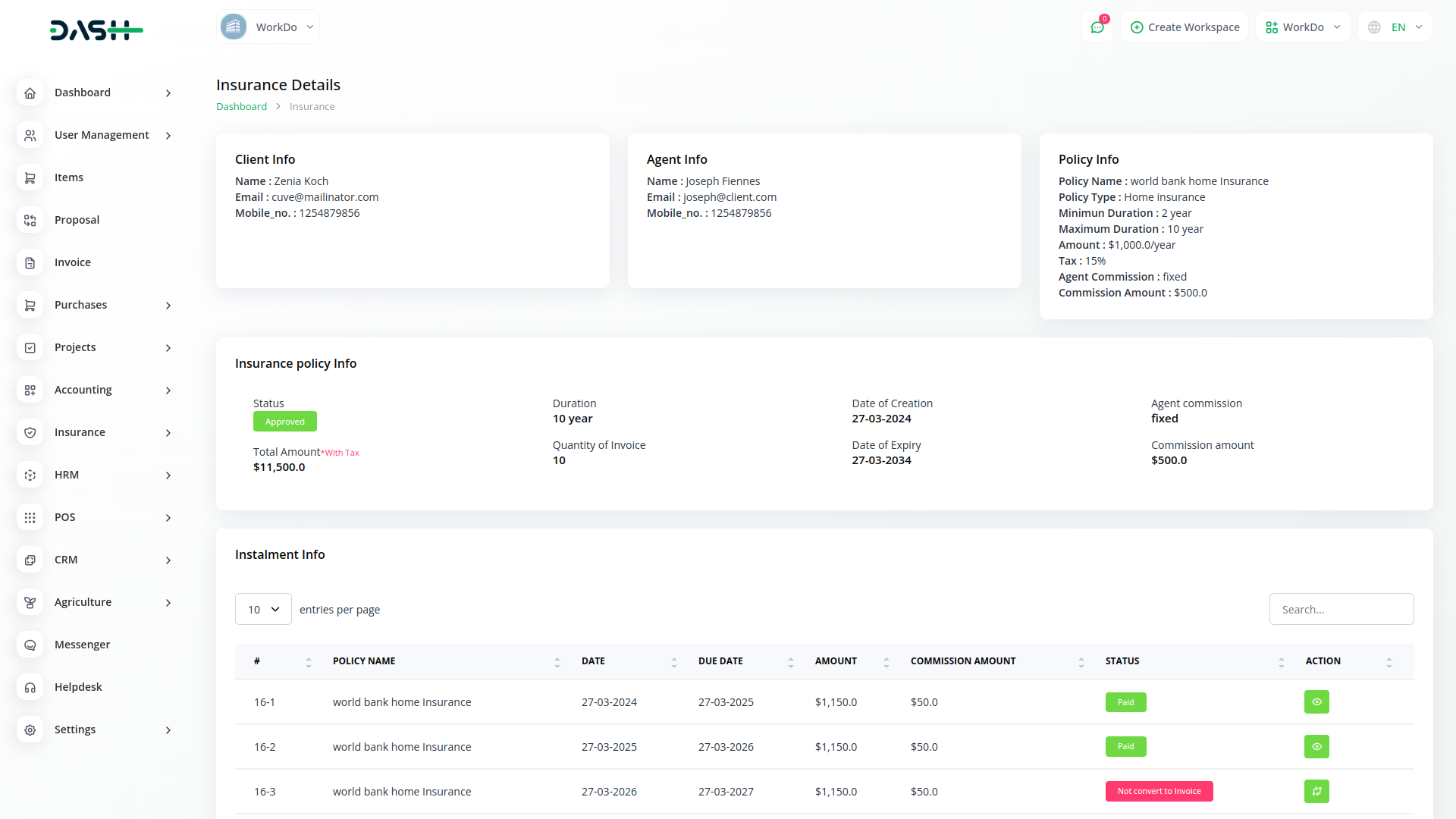 Streamline your insurance operations effortlessly with our comprehensive module in Dash SaaS. From client management to policy administration, access all your insurance-related tasks in one centralized dashboard, ensuring efficiency, accuracy, and compliance at every step.