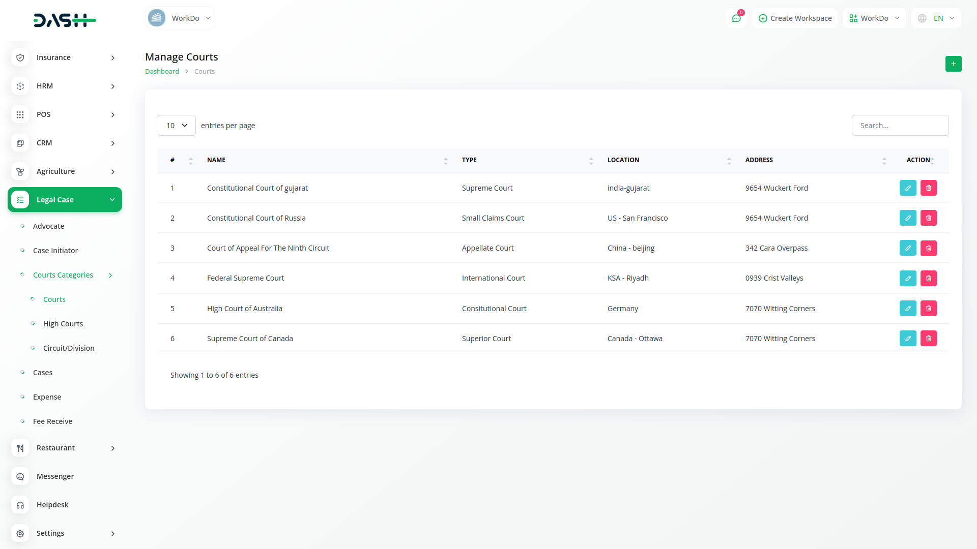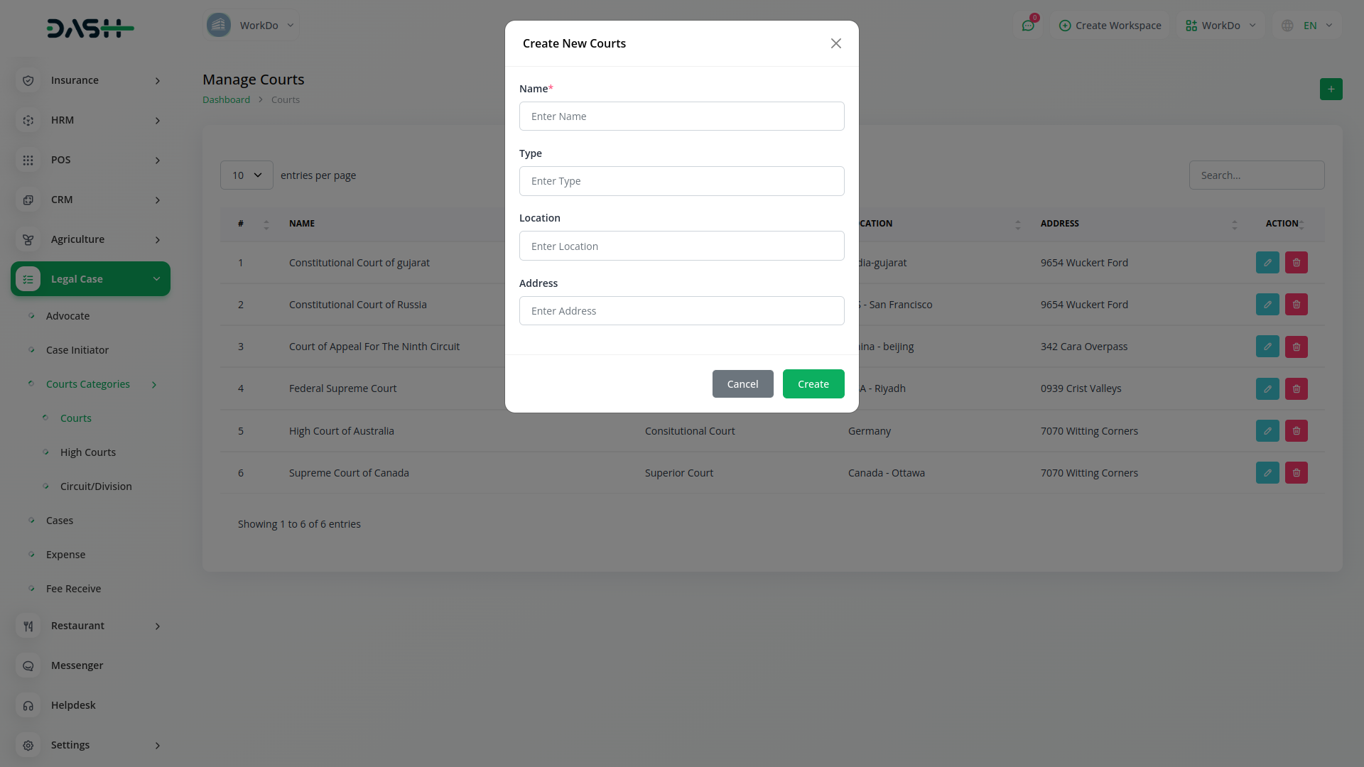 The Legal Case Management module in Dash SaaS is a dedicated tool for simplifying legal processes. With a user-friendly interface, it allows users to efficiently manage information related to advocates, case initiators, and court categories. This module serves as a central hub, facilitating the organization and accessibility of critical legal data within the broader Dash SaaS platform.